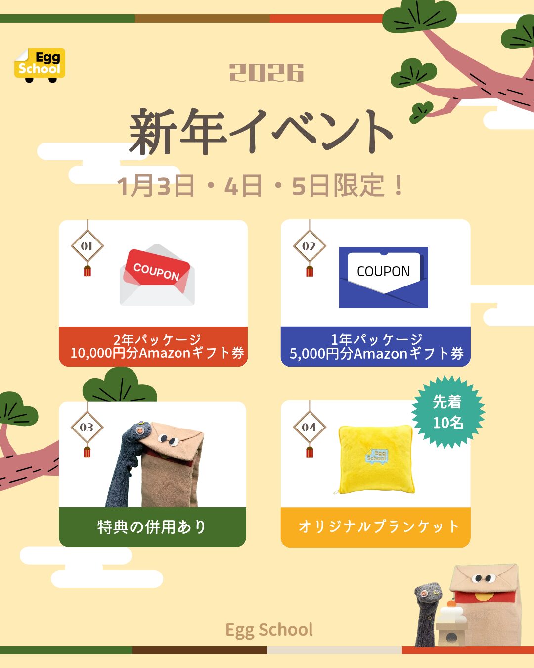 【こちらのキャンペーンは終了しました】エッグスクールでは2026年1月3日(土)~1月5日(月)までの3日間限定で、2026年の新年イベントが開催されます。