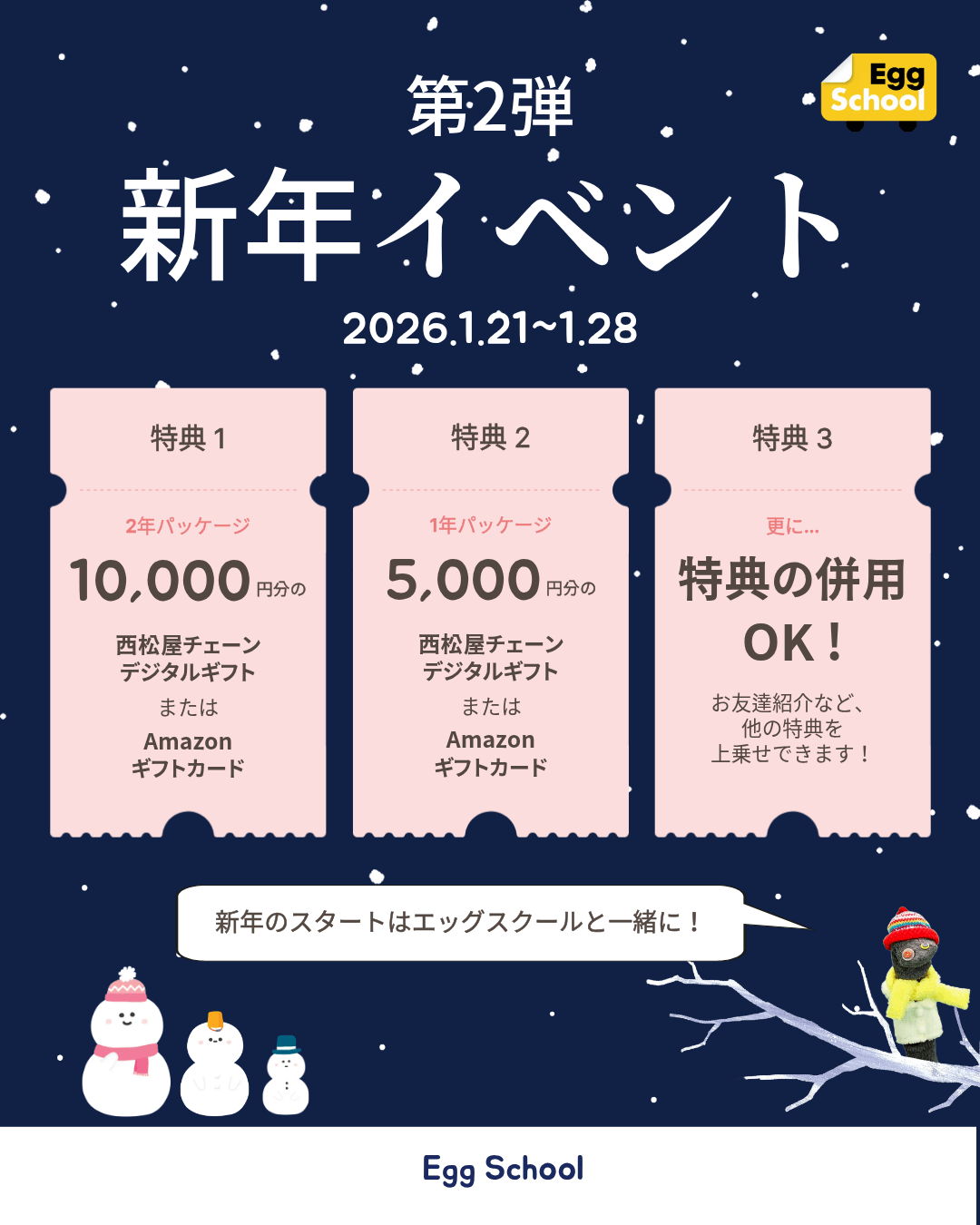 ⑦ エッグスクール2026年新年イベントで最大10,000円分ギフト券