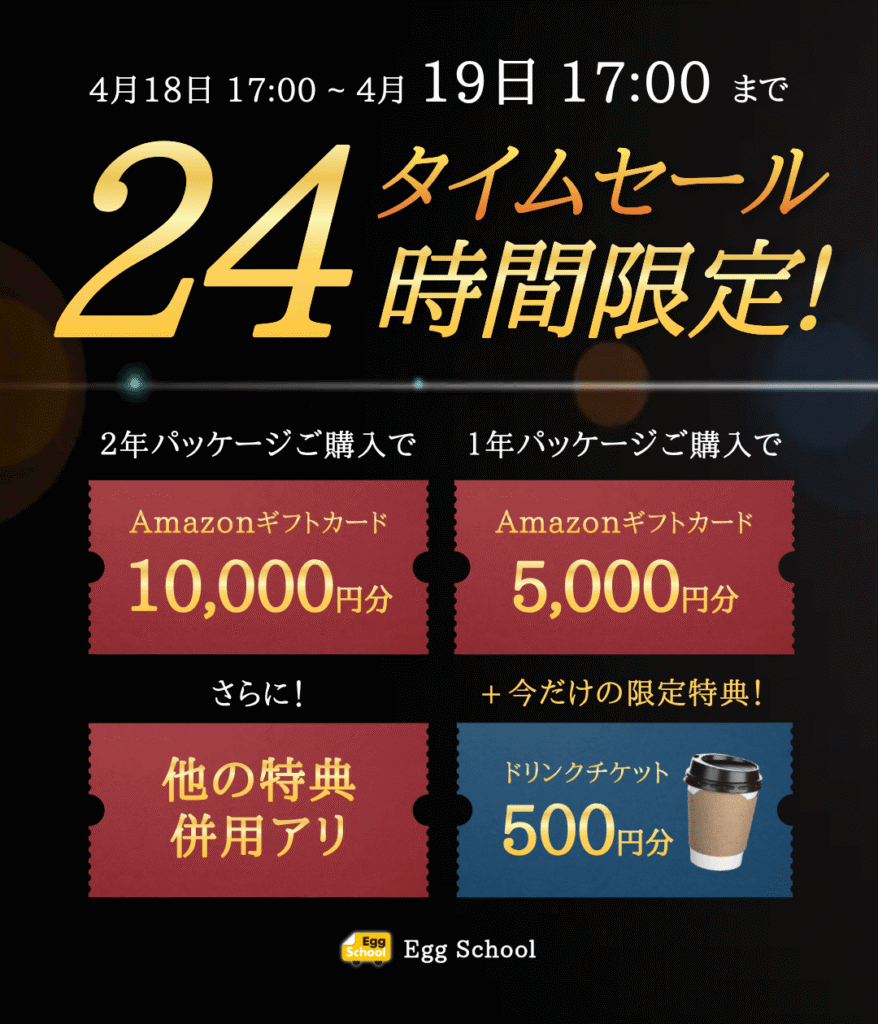 エッグスクールでは、4月18日(土)17時~19日(日)17時の24時間限定でタイムセールが実施されます。