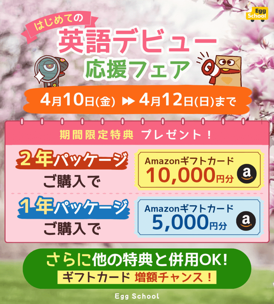 - エッグスクール2年パッケージで5,000円分、エッグスクール1年パッケージで3,000円分のAmazonギフトカードがもらえる。