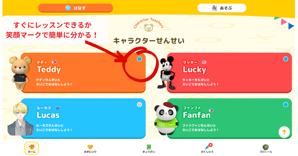 先生の横に表示される顔のマークが「笑顔マーク」ならすぐにレッスン可能です。