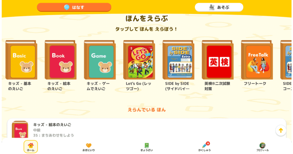 ネイティブキャンプキッズのキッズモード画面では、子ども向けにおすすめの教材が最初に表示されます。