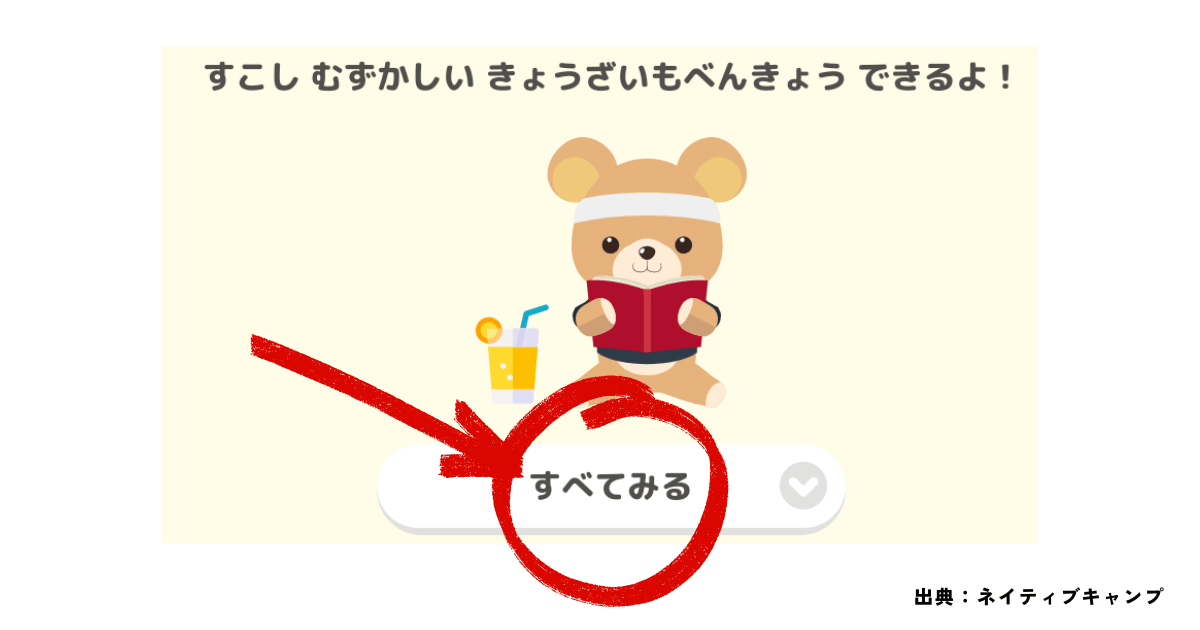 しかし、下記の「すべてみる」ボタンをタップすれば、ネイティブキャンプで使える教材が全て表示され、好きな教材を選べます。
