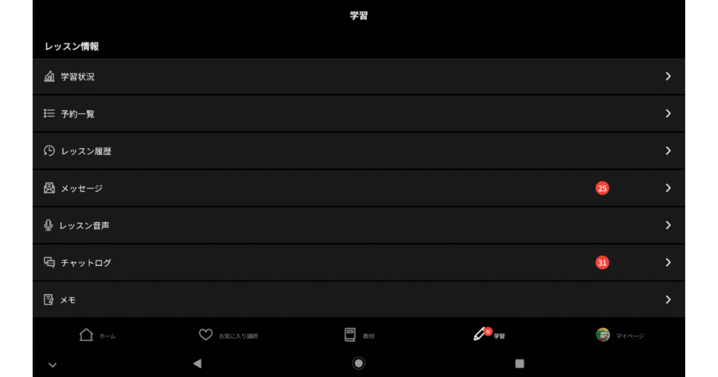 これまでのレッスン時間・回数などの学習状況やレッスン履歴を確認したり、レッスン時の音声などを聞いたりすることができます。