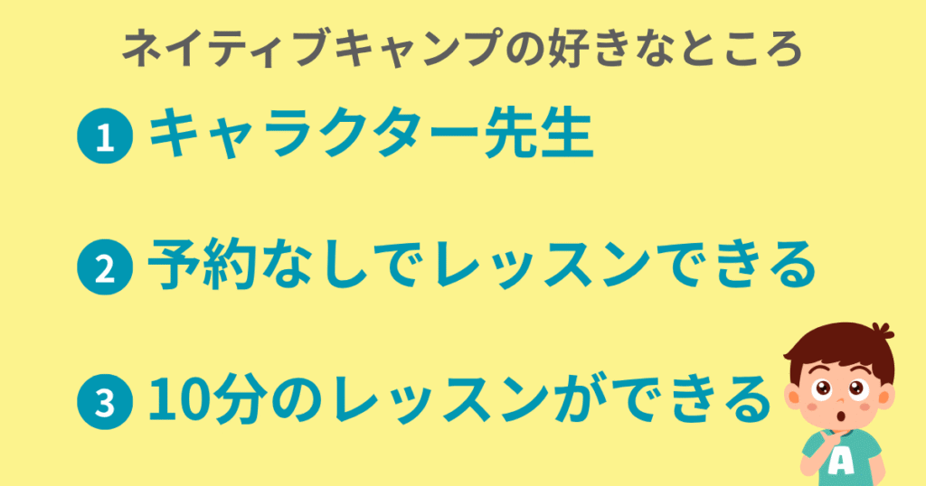 ネイティブキャンプを続けている息子に、ネイティブキャンプの「好きなところ」を3つあげてもらいました。