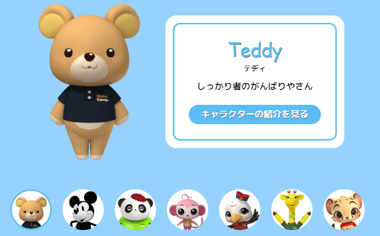 ネイティブキャンプの大きな魅力は、先生がキャラクター姿で登場するキャラクター先生とレッスンができること。(普通の先生とのレッスンももちろん可能!)かわいいクマやパンダの見た目で話してくれるので、子供が構えずに遊び感覚でレッスンできます。