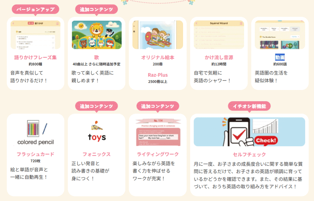 子どもたちの年齢やレベルに合わせた多様な教材が揃っており、英語の基礎から応用までをカバーしています。