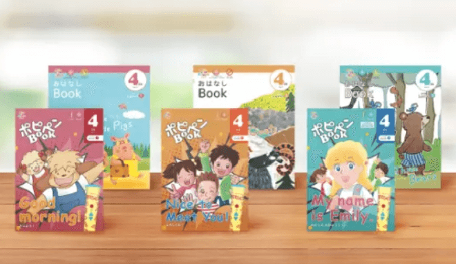 具体的には日本語訳のついていない絵本や、日本語での説明がない動画を用いた教材です。